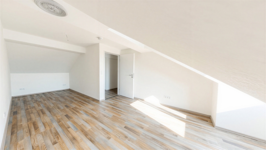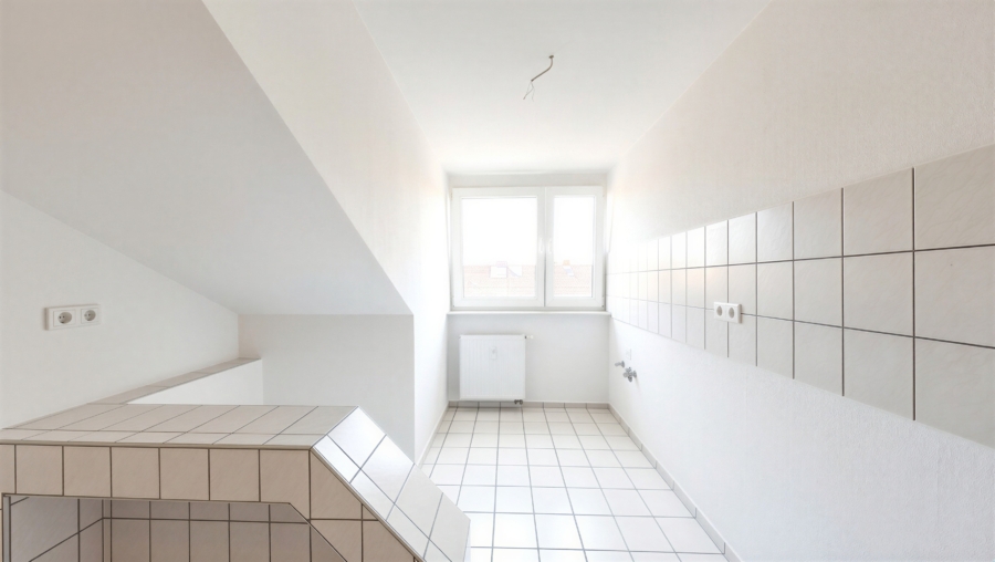 Bereits beim Betreten der Wohnung fällt die helle und freundliche Wohnatmosphäre auf. Durch die Dachgeschosslage und die großzügigen Fensterflächen wirkt die Wohnung besonders lichtdurchflutet und einladend. Der Wohnbereich bietet ausreichend Platz für eine gemütliche Sofaecke und bildet den zentralen Mittelpunkt der Wohnung.